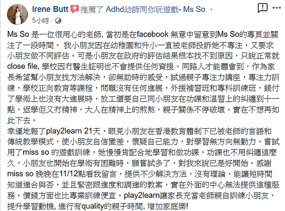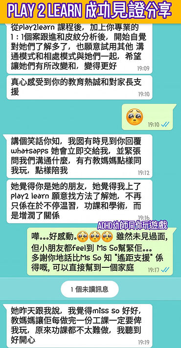 Miss So係一個非常有Heart的老師 , 我個仔差不多3歲開始上Miss So嘅“玩出專注力”課堂。每堂課都有唔同又獨特而且有針對性嘅遊戲去幫助小朋友提升專注力。經過一段時間之後,我小朋友唔止專注力好佐,就連表達能力同情緒處理能力都好佐,每次都會好樂意同我分享上堂內容及同玩伴間嘅互動。喺每次課堂後Miss So嘅課堂總結言談間,我更加了解到我小朋友需要如何去提升各方面嘅能力,有咩遊戲可以喺屋企玩。作為家長嘅我,有時遇到教育方面問題,我會請教Miss So,Miss So都好樂意咁去了解同解答,及提出建議,之後仲會問返問題有冇解決到。