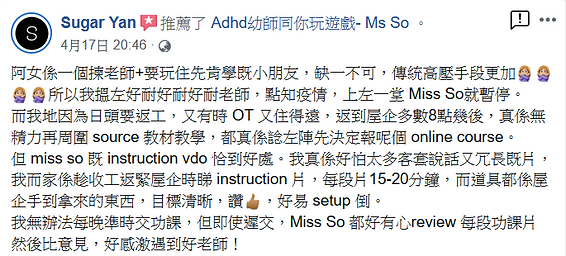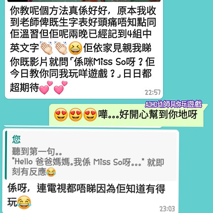 當初巧遇Miss So的專頁,給尚未確診的特殊學習需要孩子試上小組課,孩子玩得開心便好,也沒有特別期望有什麼效果。 上了4、5個月左右,見到孩子的語言動機和能力有明顯進步,後來做評估時醫生都說看得出孩子是有接受過一些訓練。 Miss So雖不是某方面的專業,但就是因為她什麼都不是,所以不會被任何一個框架局限了自己,而會針對每個小朋友的特質而給他們設計有趣的玩意,我最欣賞Miss So的教學不單單以改善學業成績為目標,而是非常注重孩子的品德教育和行為改正,實是難得的好老師 👍。